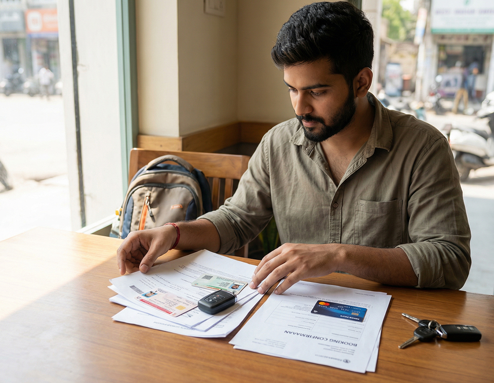 You need a valid driving licence (with self-drive endorsement), government ID (Aadhaar/Passport/Voter ID), credit card for deposit, and booking confirmation.